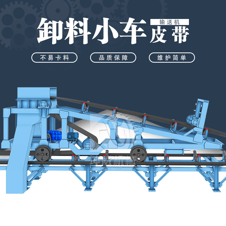 皮帶輸送機卸料小車在行走裝置上和可逆配倉帶式輸送機相同,都是由行走輪以及輕軌組成。卸料裝置在皮帶輸送機上進行行走。